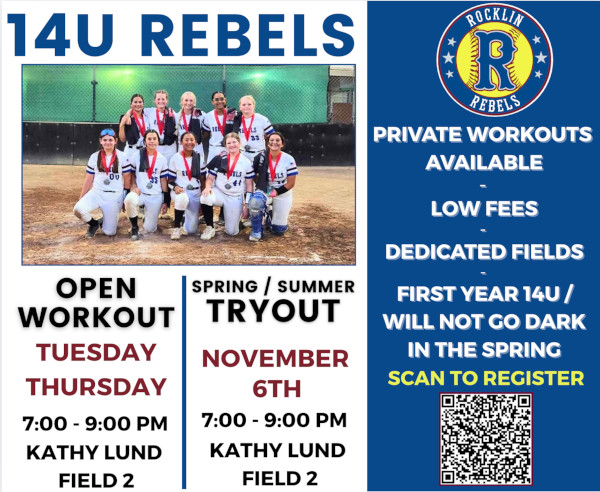 The 14U Rebels are hosting a workout November 4, 2025 and tryout on November 6, 2025. All positions open. Complete the Google Form! We have low fees and dedicated fields with lights. We play local to the Sacramento area.